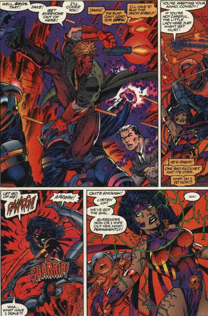 Portacio did a very good job with the military look of Wetworks and he drew their guns with a high amount of detail that should be seen (you should try using a magnifying glass on this comic book). Not only that, his art on military hardware such as the gunships, the interiors plus equipment all have that detailed appearance. When it comes to action, I believe that Portacio took a lot inspiration from Hollywood action flicks (most notably Predator) on portraying Wetworks members using their guns and positioning during battle.