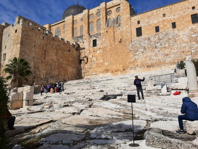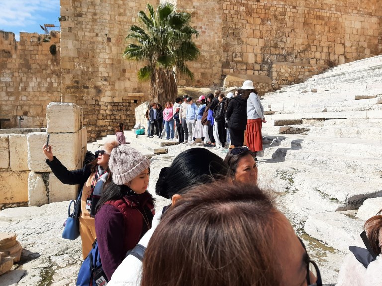 Our pilgrimage tour group in the foreground, and another group in the background. The Southern Steps is an essential place for Christians to visit in Israel.