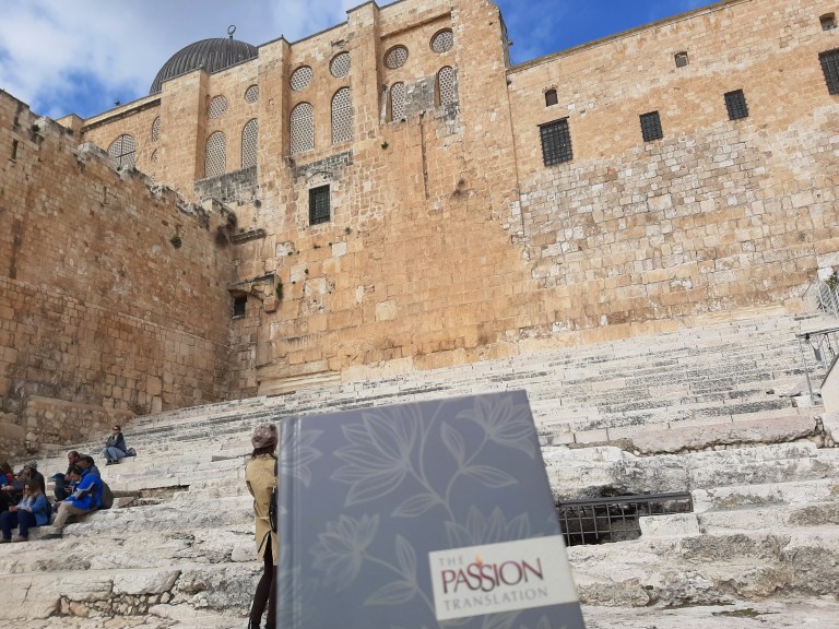 I brought the Passion Translation Holy Bible with me at the Southern Steps. After taking this image, I climbed up the steps, reached the Southern Wall and touched it.