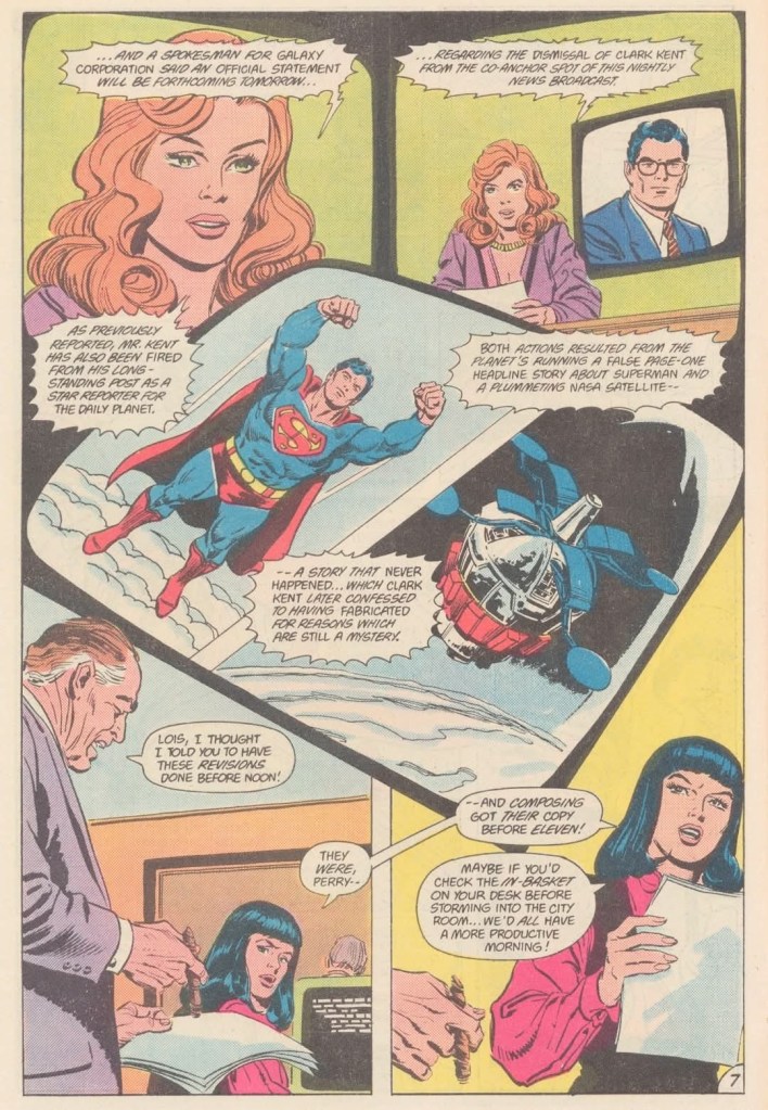 Elsewhere, Lana Lang announces news to TV viewers regarding the dismissal her of close friend Clark Kent which was the result of the fake headline news story about Superman and the NASA satellite. In another location, Lex Luthor is very pleased watching the same broadcast knowing his plan of ruining Superman succeeded and got Clark Kent as a fake news casualty. Luthor is not done with Superman yet…