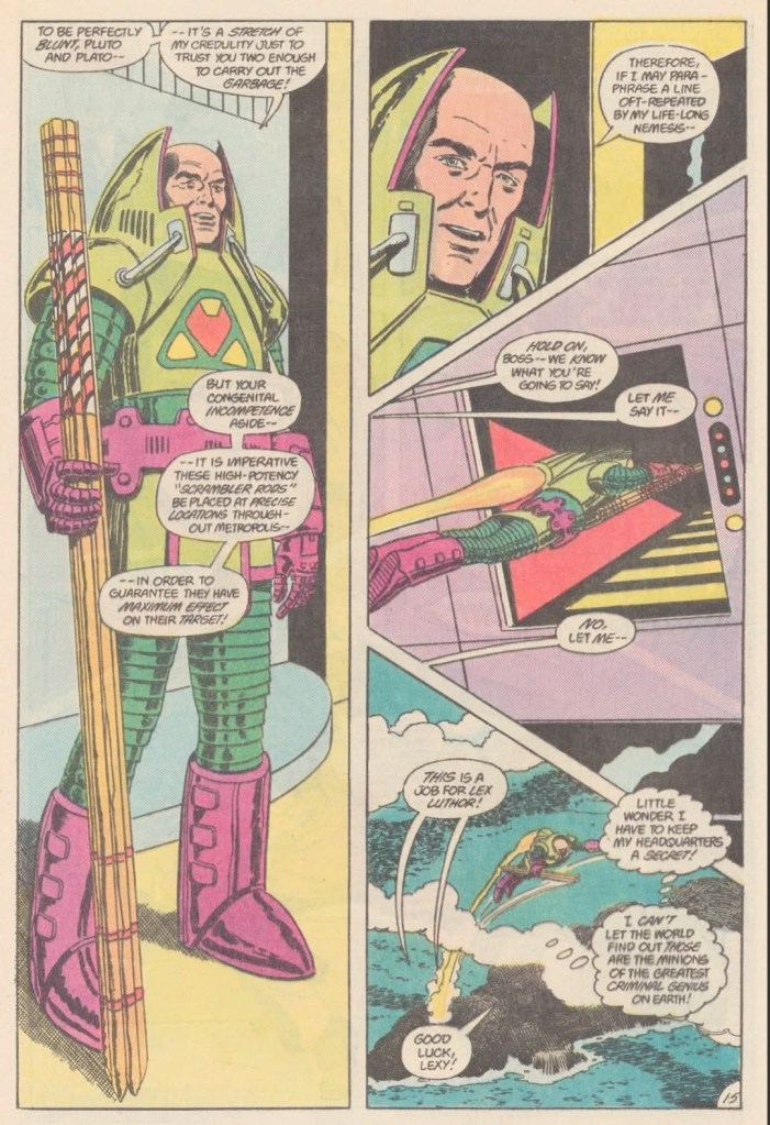The powerful writing by Cary Bates does not end there. In this comic book, you will see Lex Luthor execute his other plans to ruin Superman whom he personally accused over the loss of his family and his own world Lexor (click here and here for references). This is a Luthor who is not simply being evil but also someone who is well organized, strategic and even fearless. By this stage, the criminal mad scientist Luthor has accumulated a lot of resources to have his own headquarters, technologies and a dedicated staff. In some ways, Luthor in this comic book eerily resembled his financial tycoon version in the post-Crisis era (click here and here for relevance).