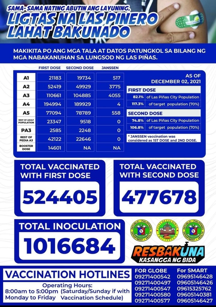 Meanwhile, the City Government is already handling the online registration process for COVID-19 vaccination for local minors (aged 12 to 17) which can be done at http://laspinascityonline.laspinascity.gov.ph/eCVRS/