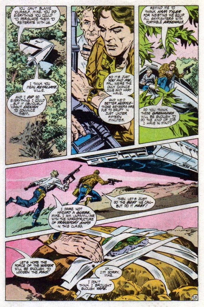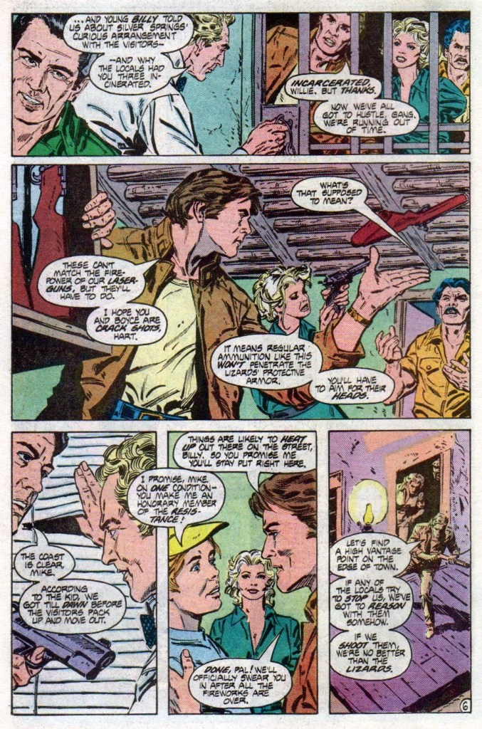 More on the writing, there is this very impassioned speech by Mike Donovan that makes clear the true intentions of the Visitors as the town people accepted the aliens so warmly while turning their backs on the human race. So far, this is the most socially relevant expression in this old comic book series and if you take into context the fact that certain people in the world today would give up on their established values (examples: patriotism, the nuclear family) in favor of destructive, radical values and concepts (examples: Marxism, Socialism, Communism, Fascism, critical race theory) and then deform society with them, Mike Donovan’s speech remains strongly relevant. In fact, I easily imagined the voice of Marc Singer speaking as I read the said speech.