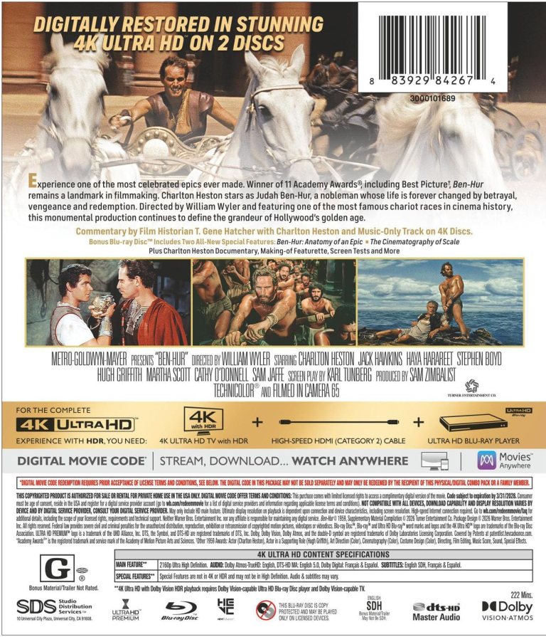 For the 4K Blu-ray collectors and fans of the 1959 movie reading this, posted below are the technical details from the Blu-ray.com page of Ben Hur (1959) 4K Blu-ray. Pay close attention to the details…