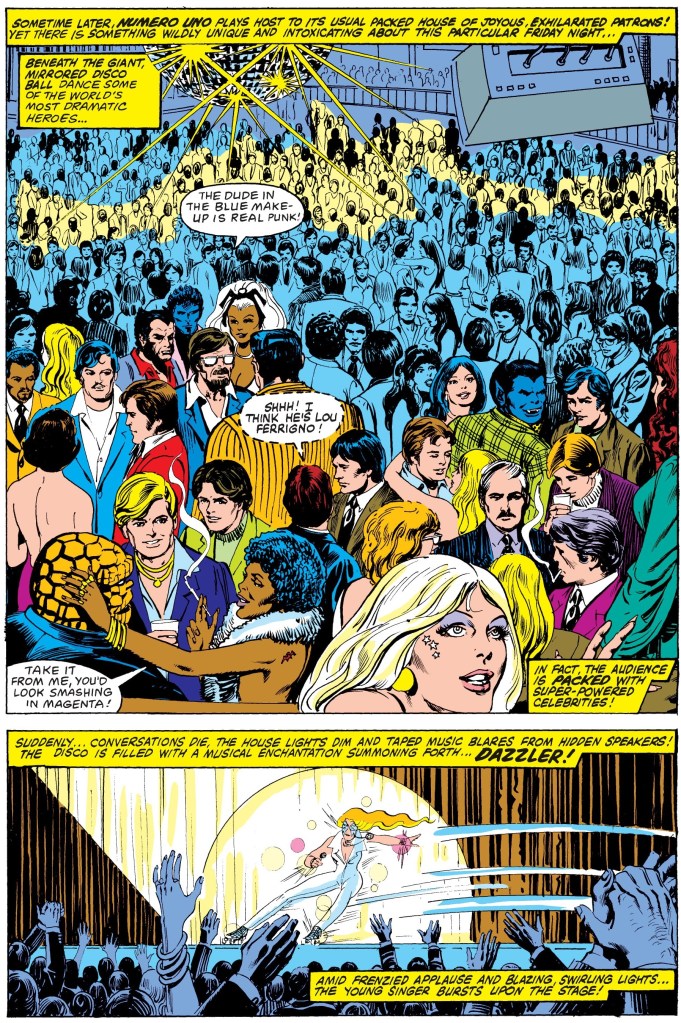 The story begins with Dazzler preparing for her big show at Numero Uno, a prestigious disco in the city of New York. Just before the show starts, a huge crowd of people are in attendance and among them are Wolverine, Peter Parker (Spider-Man), Captain America, Johnny Storm, Ben Grimm and Tony Stark (Iron Man) to name some.
