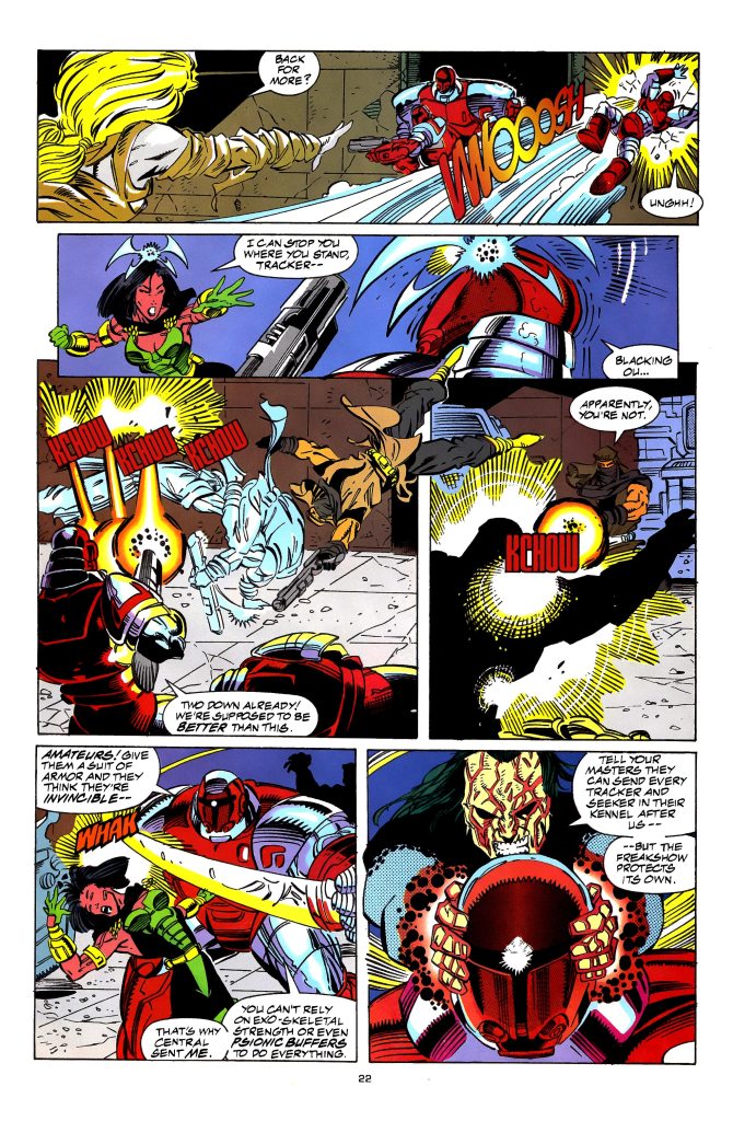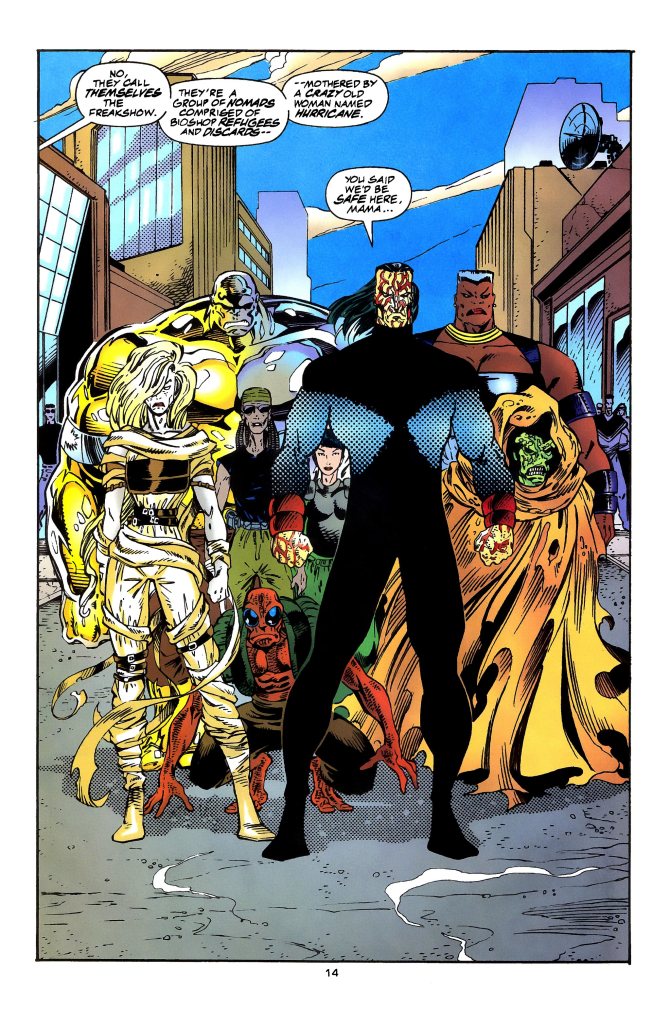 In this comic book, John Francis Moore really kept on focusing on developing the X-Men while keeping the narrative fresh with twists and the occasional moments of shock. While the cover of this comic book expressed the return of the other X-Men member Eddie/Metalhead (who stayed behind and separated from Xi’an’s mutants), the story here surprisingly had much less focus on the X-Men of 2099 and focused more on the Freakshow (which Metalhead is now part of).