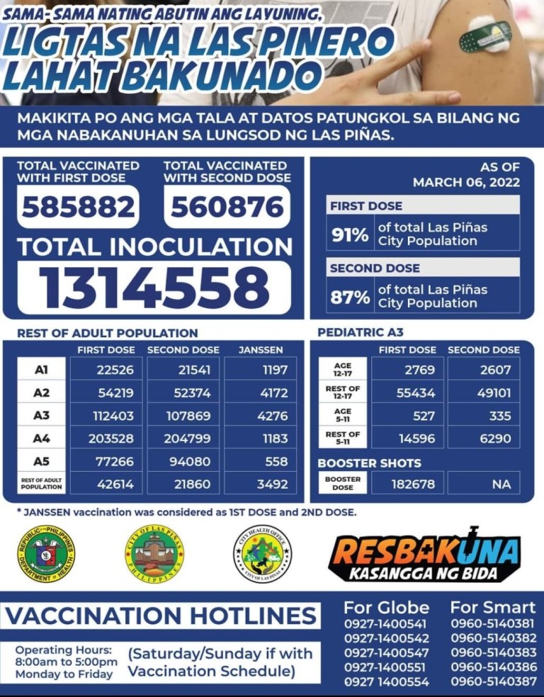 For the first time since March, the City Government of Las Piñas finally released through their Facebook page an update about their collective statistics about COVID-19 vaccination which includes initial and 2nd booster shots (2nd booster shots started in April and walk-ins for such shots were accepted).