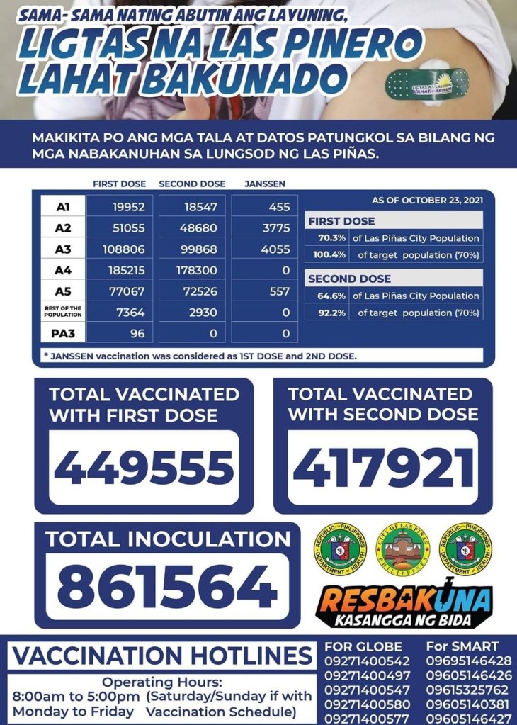 Recently it was reported by the Manila Bulletin that City of Las Piñas achieved herd immunity based on statements made by Mayor Imelda Aguilar. This past Monday, the City Government’s official Facebook page published the latest vaccination statistics showing that the citywide inoculation count for COVID-19 has exceeded more than eight hundred sixty thousand as of October 23, 2021.