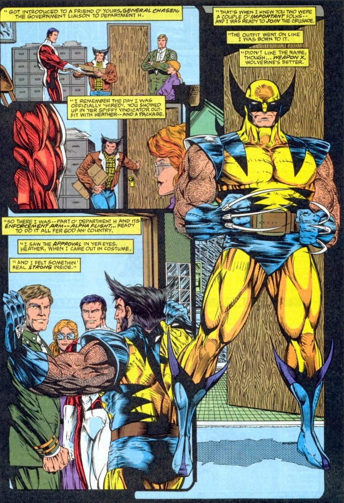 As he listens to Alpha Flight from a distance, he hears Vindicator mentioning that a certain lab is expecting their team. This causes Wolverine to remember the traumatic time he had as a live test subject of Weapon X…