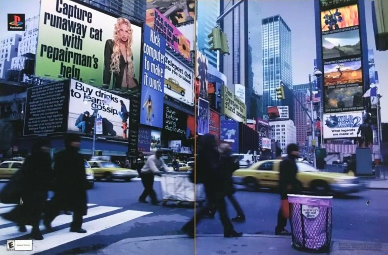 Now this is one of the most weird and the most uninteresting game print ads of the 1990s. For the newcomers reading this, Wild Arms 2 was a sequel to the 1997 hit game Wild Arms released on the original PlayStation console. Due to the 1997 game’s success, a fan base of Wild Arms was established and the 1999 sequel was anticipated by the fans. In a very odd and illogical move, Sony Computer Entertainment came up with the Times Square setting for Wild Arms 2’s North American print ad and because they allowed so much other text and images (appearing as billboard ads) on the buildings in the background, details about the game itself got overshadowed. By simply looking at this print ad, it is simply too easy to overlook Wild Arms 2 as the featured game. Can you see the references to Wild Arms 2 here?