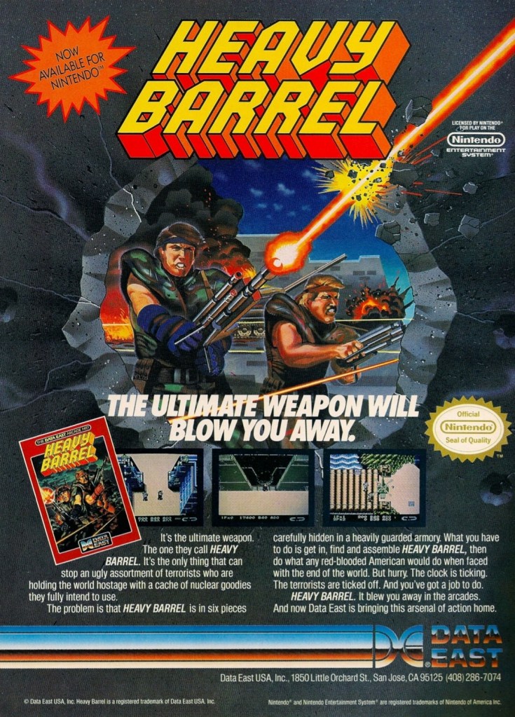 Originally released in the arcades by Data East, Heavy Barrel was released on the Nintendo Entertainment System (NES) in 1990. Similar with Contra and Jackal, this game had a strong military theme and shooting-oriented gameplay complete with missions that instantly reminded players about war. The military aesthetic and the showing of guns are easily the most eye-catching part of this print ad geared towards the NES userbase which had lots of young children among the players. To say the least, Heavy Barrel’s print ad was entertaining to look at.
