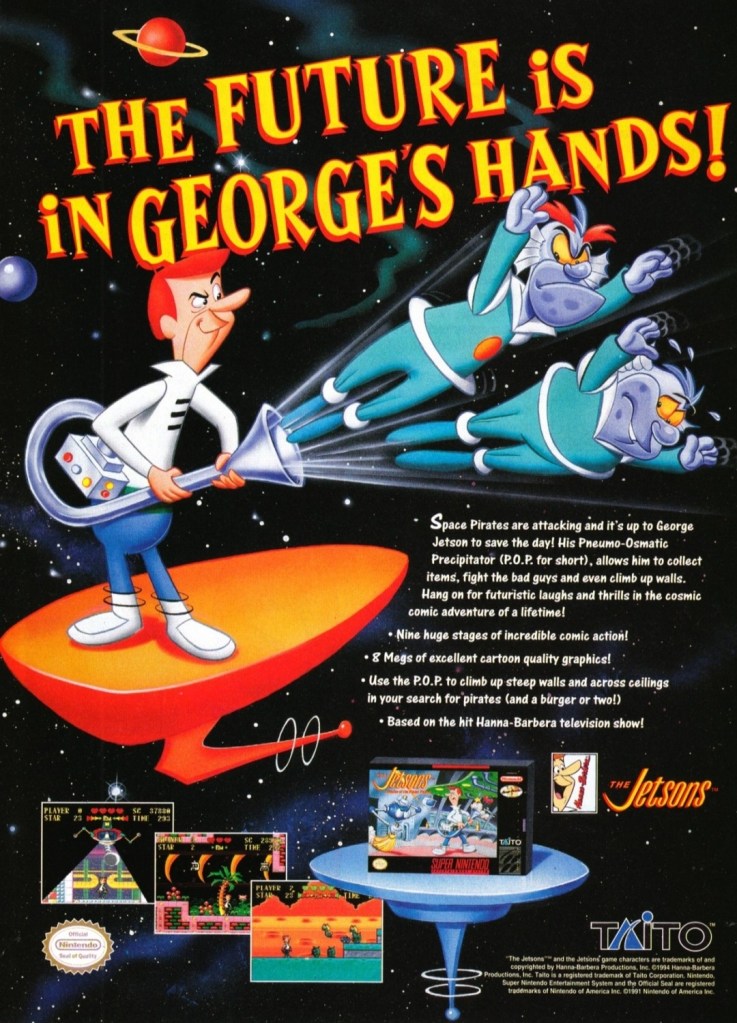 Based on the animated series, The Jetsons: Invasion of the Planet Pirates was released on the Super Nintendo Entertainment System (SNES) in America as well as on the Super Famicom in Japan in the mid-1990s. This game’s print ad had eye-catching artwork, carefully laid down key details (including the promise of cartoon quality graphics) and showed a few screenshots. The game attracted mixed reviews from critics and I don’t know any fellow gamer who played it.