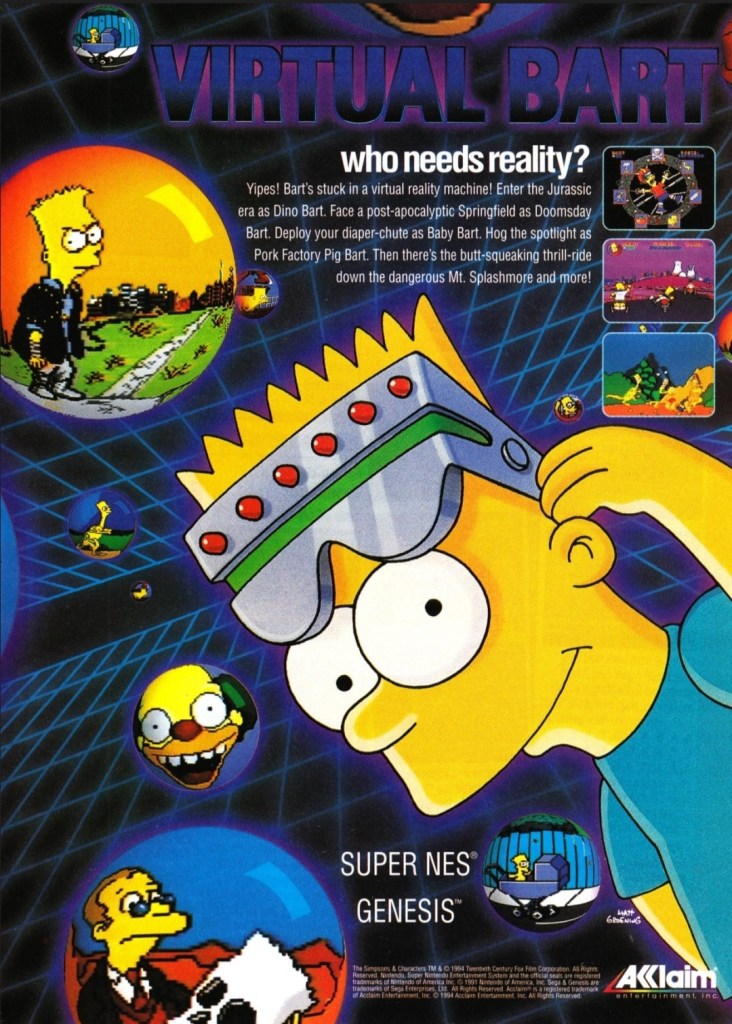 Decades ago, The Simpsons made big waves on television and quickly emerged as a fine addition to American pop culture. That being said, it was not surprising at all that video games based on the show got made and Virtual Bart was one of them. This Virtual Bart print ad appeared in some comic books I read in 1994 and the ad makers made efficient use of the single-page layout showing that the game was not a mere 2D side-scroller as its concept emphasized Bart Simpson’s virtual reality escapades. This game, which had mini-games and different gameplay styles, received review scores ranging from negative to positive.