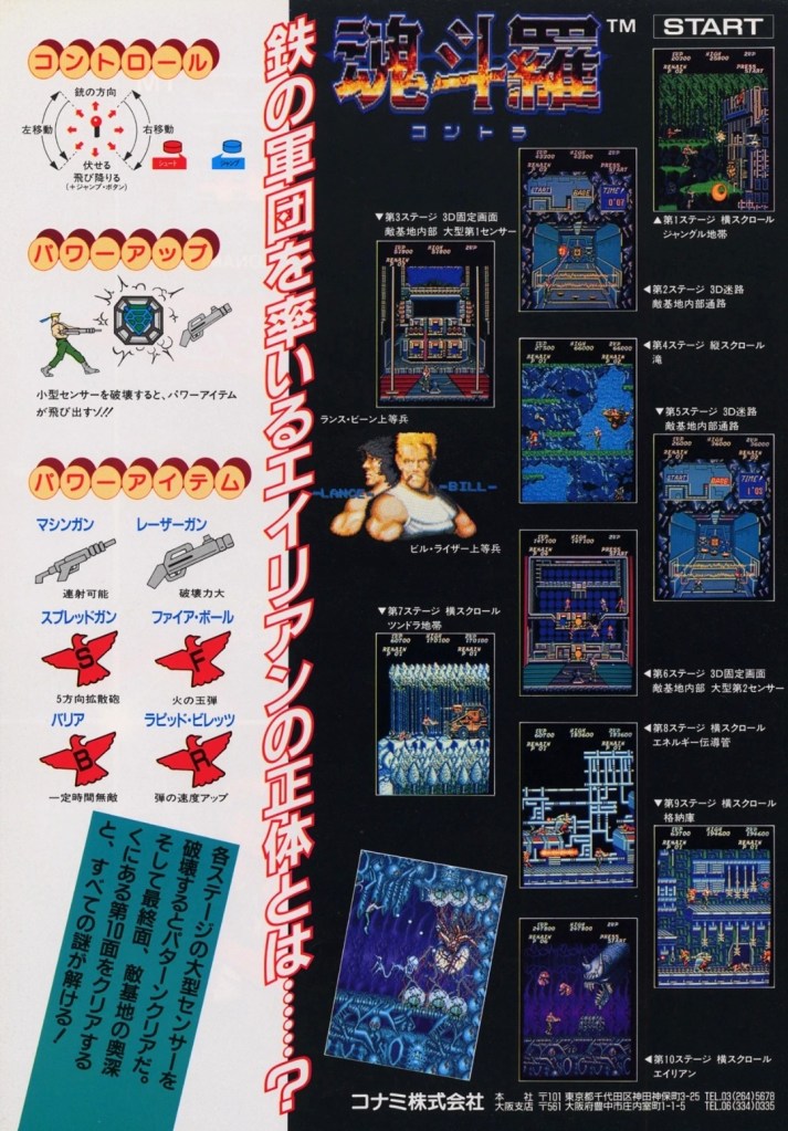 As mentioned before, Konami’s long-running Contra games franchise first started in the arcades in Japan. As seen in the Japanese arcade flyer, it was clear that the company not only had a clear vision of Contra’s visual concepts but also was pretty organized with explaining lots of details (examples: the 8-direction controls, types of weapons or ammunition available, level design differences) that both players and arcade operators can learn from. If you look closely at the rear of the flyer, you will see the two characters already identified as Lance and Bill which clearly showed the Japanese creators had the creative details really organized.