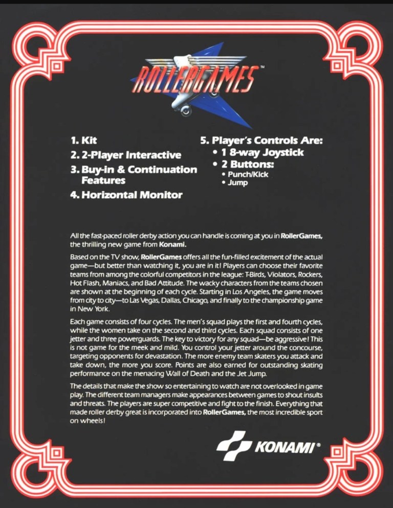 Based on the competition-oriented TV show, the RollerGames arcade game from Konami was both unique and fun to play. As with their other arcade flyers, Konami hired models to emphasize RollerGames’ core concept by appearing in full costume (as roller-skating participants), and then inserted screenshots of the game. The rear of the flyer had the technical details in simplistic fashion and they were clearly written with arcade operators in mind. The 3-paragraph text descriptions emphasized what players could expect, what options are available and how the game connects with the TV program it was based on.