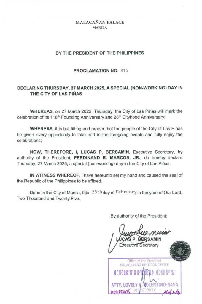 Malacañang has officially declared March 27, 2025, as a Special Non-Working Day, to give way for the celebration of the 118th Founding Anniversary and 28th Cityhood Anniversary of Las Piñas.