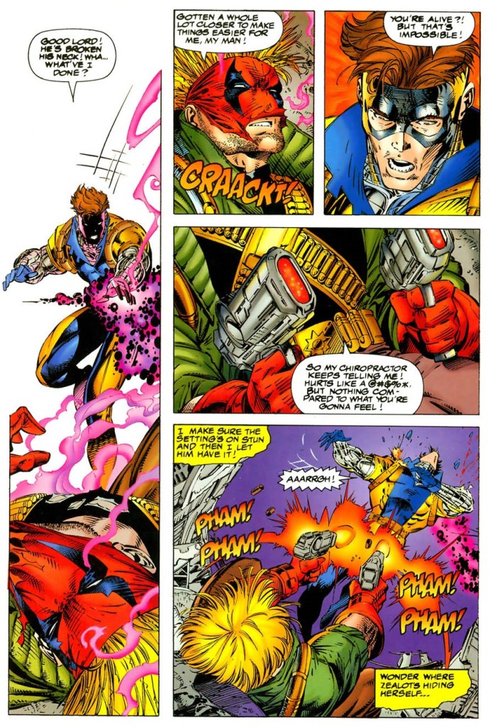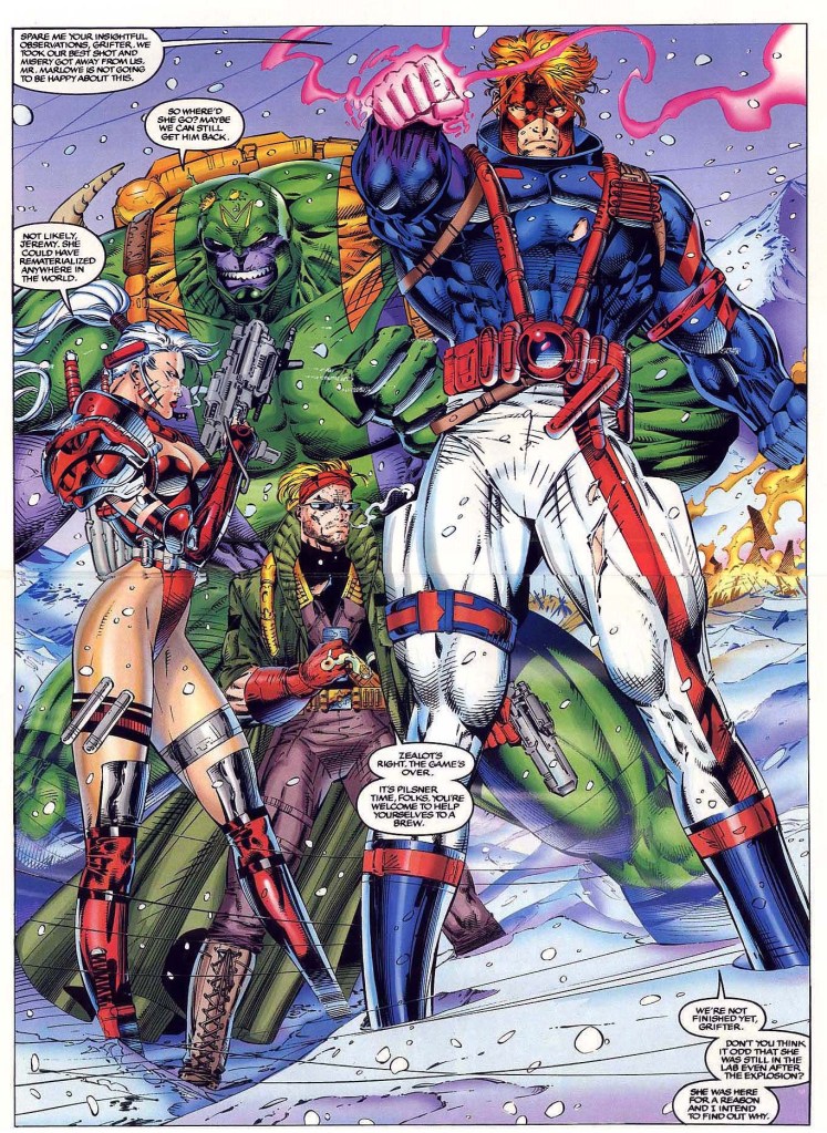 Knowing he is outnumbered, he quickly runs out of the office for safety. He heard one of the men referred to him as a crossbreed whelp. As soon as he finally leaves the building, Reno sees the WildCATS team composed of Grifter, Spartan, Zealot, Voodoo and Maul. Thinking that the WildCATS are out to kill him like the armed men, Reno keeps on running away.