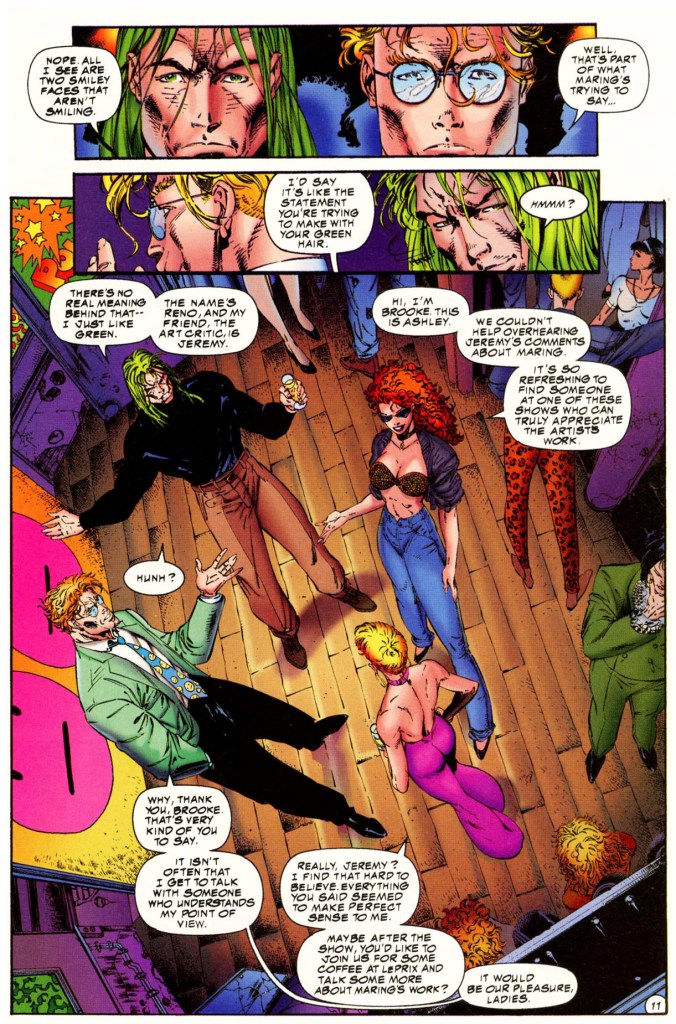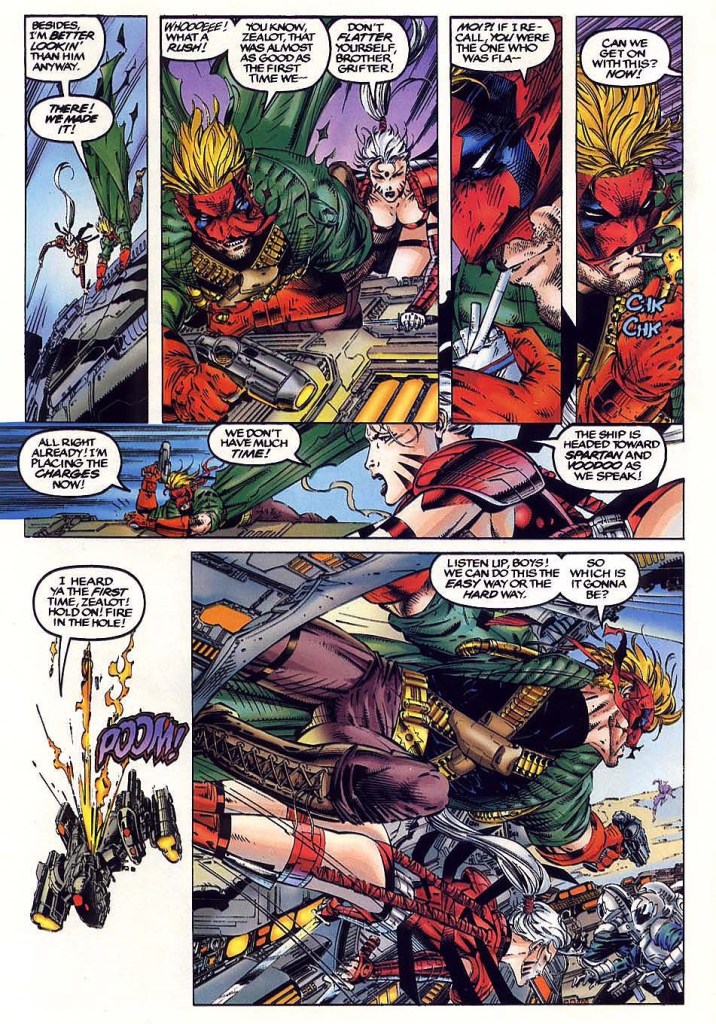 Suddenly, a group of people are rushing towards the WildCATs. Powered with the Sight, Voodoo realizes that the mob is composed of Daemonites disguised as humans. The WildCATs and the mob engage in battle.