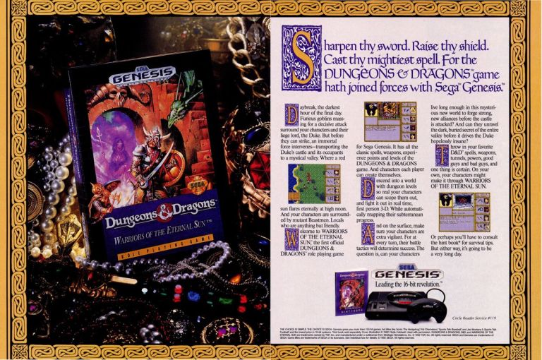 By the year 1992, the fantasy games franchise Dungeons & Dragons was wildly popular as players around the world kept enjoying the tabletop RPG modules (using dice, pen paper) as well as many computer and video games already available. Sega acquired a D&D license and eventually released Dungeons & Dragons: Warriors of the Eternal Sun exclusively on their Genesis console in 1992. To promote it, Sega produced a 2-page print ad that had one half showing the game’s box placed with jewelry while using the other half to show the screenshots, descriptive text and other details. The way it was presented, the print ad was cleverly structured to attract the attention of Sega Genesis gamers as well as Dungeons & Dragons fans. The game ended up as the first and only official D&D product for the console.
