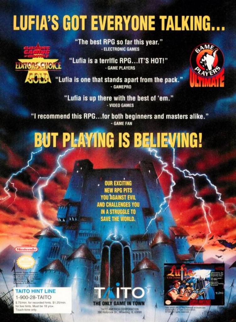 Upon release in America in late 1993, Taito scored gold as Lufia & The Fortress of Doom on the Super Nintendo Entertainment System (SNES or Super NES) became a critical and commercial success. In fact, it literally gained steam during the early months of availability and ended up as the top-selling SNES game in America for the month of February of 1994. Take note that at this particular point of time, RPGs on game consoles in America were not yet in high demand as gamers’ tastes were different. When it comes to the marketing, Taito came up with a single-page print ad showing fantasy artwork, the game’s box cover and the published quotes from game critics who gave the game positive reviews. This is smart marketing on the part of Taito.