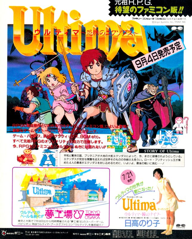 Released in Japan under the title Ultima: Kyoufu no Exodus, Ultima III: Exodus was a breakthrough for the series as the Famicom version marked the first console release for Japanese gamers (note: the game was also offered for MSX and other computer systems in the country). The anime-style artwork used for the print ad is the same virtually the same with the front cover of Famicom version. Very notably, the art on the covers of the PC-88 and PC-98 versions were different.