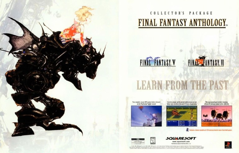By the year 1999, Squaresoft established itself as the best role-playing game company as they achieved critical and commercial success with Final Fantasy VII in 1997, Brave Fencer Musashi, Parasite Eve and Xenogears in 1998. For 1999, Squaresoft decided to bring ports Final Fantasy V and Final Fantasy VI – both games were released in cartridge format on Super Famicom/Super NES some years prior – to their fans who owned PlayStation consoles by releasing the collection called Final Fantasy Anthology. For the North American market, Squaresoft aggressively promoted the 2-game collection with the above 2-page print ad on several video game publications. One half featured exquisite artwork by Yoshitaka Amano and the other half showed the screenshots, descriptions and details. Clearly the ad was made with Final Fantasy fans in mind and it was also clever with the use of nostalgia.
