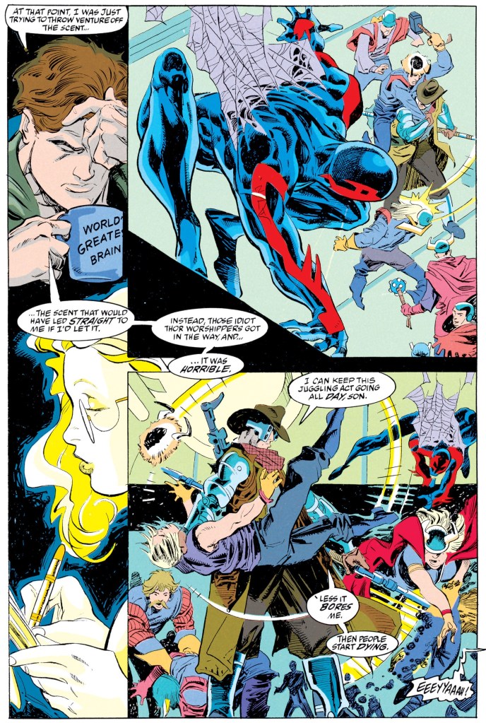 With those details laid down, here is a look back at Spider-Man 2099 #34, published in 1995 by Marvel Comics with a story written by Peter David and drawn by Andrew Wildman.