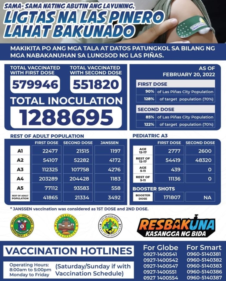 Recently the City Government of Las Piñas released to the public via social media its latest local COVID-19 vaccination numbers, including statistics for pediatric vaccination as well as booster shots count. The overall vaccination count is almost 1.3 million as of February 20, 2022.