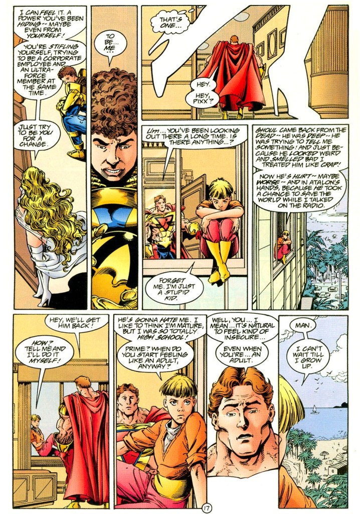 X-Men 2099 #9 (1994) has a great story concept which successfully and clearly establishes the connection between the original X-Men of Xavier with Xi’an’s X-Men. At the same time, this comic book starts a new chapter in the life of the 2099 mutants’ leader whose dark and painful past keeps disturbing him deeply. At the time of its release, the X-Men of far future were portrayed to be nomadic trying to survive and search for other mutants. This makes them distinct from the mainstream X-Men of the time and ironically they become similar with Freex of the Ultraverse.