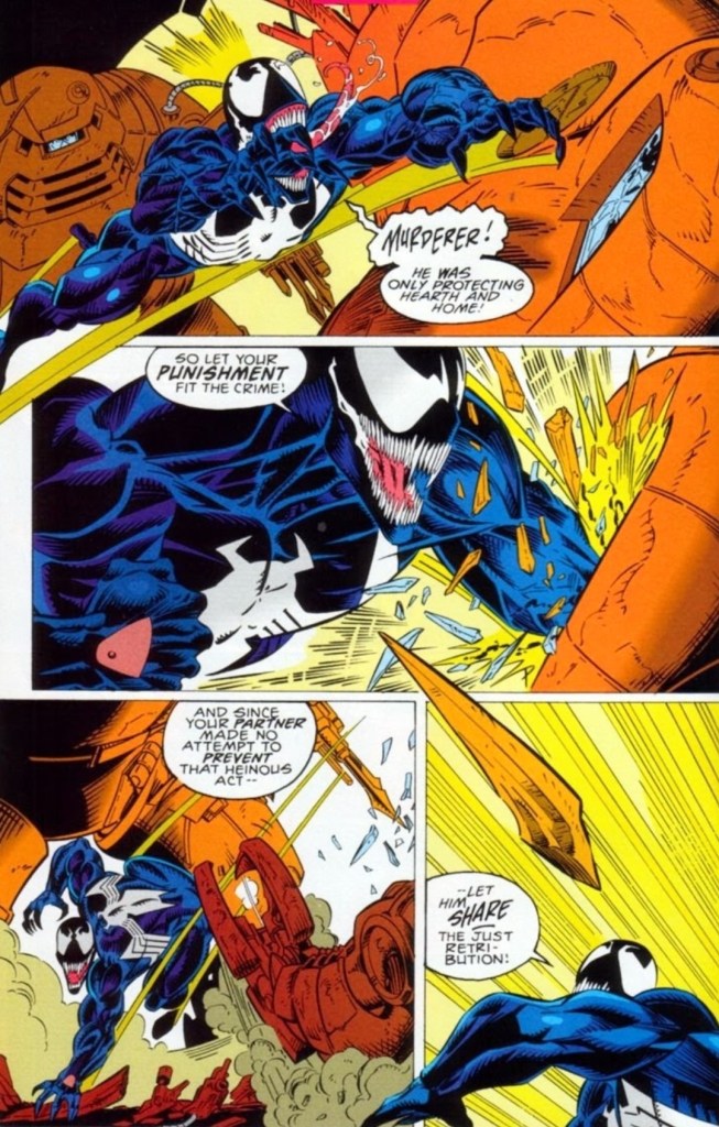 Focusing on the plot, this story took place after the events in Amazing Spider-Man #375 (1993) which was released AFTER this particular comic book. As a standalone Venom story, this one clearly portrays him more of a vigilante in the sense that he goes up against a new force of evil that happens to be pouncing on people that Venom believes to be innocent and powerless. Unsurprisingly, Venom does not seek the help of law enforcers to help the innocent but rather he takes violent action to help the victims, going as far as to kill the so-called bad guys. The bad guys in this story work under a powerful man whose son was killed by Venom a few years prior. Within the context of this comic book, the new force of evil was introduced in subtle ways.