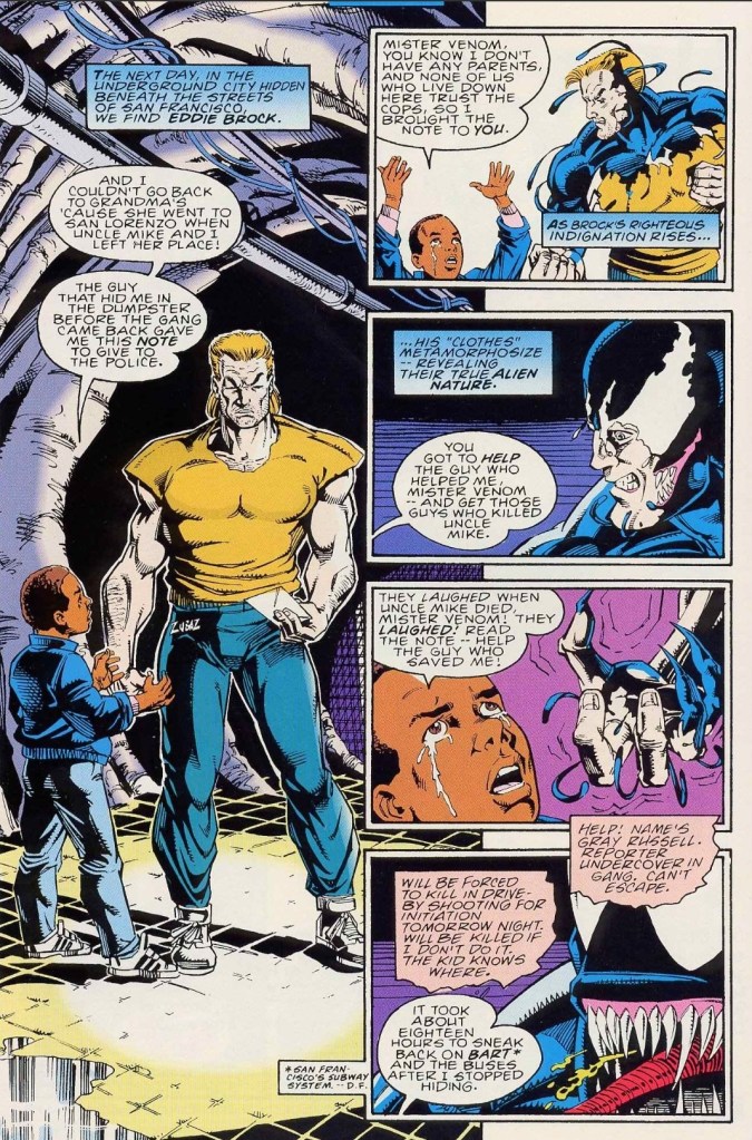 The story begins in San Francisco, California. Deep within the city, a man cornered a lady at the dead end of an alley. Just as he was about do something bad to her, Venom leaps in at them. Totally surprised, the man was easily grabbed by Venom who lifted him and hit the wall bodily. Using his costume, Venom then chokes the man to death through the mouth and nose. Venom then picks up the lady’s purse and gives it to her. As soon as Venom leaves, the shocked lady runs away screaming.