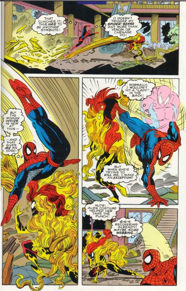 Over at Sta. Cruz in California, Spider-Man spends some of his precious time to stop some local criminals from causing anymore danger to the people. During his telephone talk with Mary Jane, he admits that has not been able to track Venom down but he has a new lead about weird creatures that have been spotted locally. A short time later, Spider-Man arrives at a shopping mall where tremendous damage of property have happened. As soon as he catches a lady and prevents her from hitting the pavement, he is shocked to see a long-haired woman wearing a living alien costume with features that are so similar to that of Venom. The symbiote-wearing woman (Scream) tells Spider-Man directly that breaking him in half will make the “little exercise” a complete success…