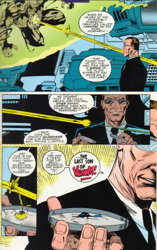 Without spoiling details and names, I should state that this comic book marks the debut of a ream of armed mercenaries led by a powerful man who lost a son because of what Venom did in Amazing Spider-Man #315 (1989).