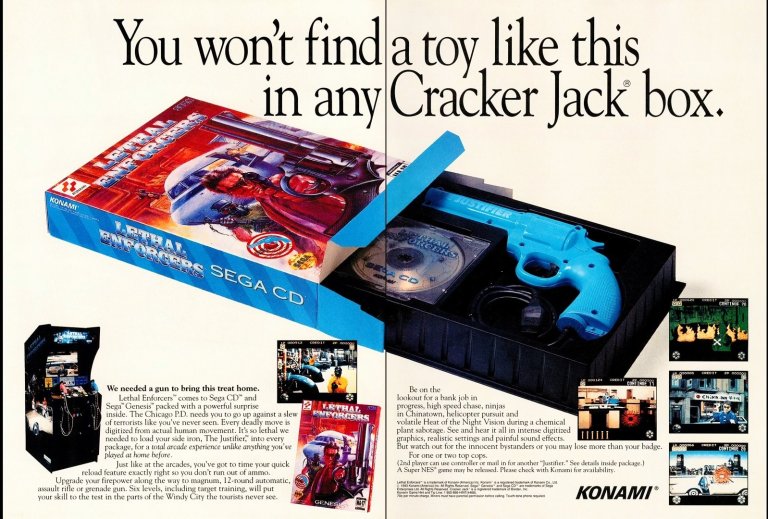 When Lethal Enforcers II: Gun Fighters was released in the arcades in 1994, it became a commercial success for Konami which went on to announce it would port the game to consoles of Nintendo and Sega at the time. While the port for the Super Nintendo Entertainment System (SNES) was never released, Lethal Enforcers II: Gun Fighters made its way to the Sega Genesis and Sega CD. The print ad of the Sega Genesis version (Sega CD mentioned in small text) had an inspired design emphasizing the Old West, shooting and the conflict between cowboys and Indians. The screenshots gave people the clear idea that Old West was the setting (versus modern day in the previous game). This is still fun to look at.