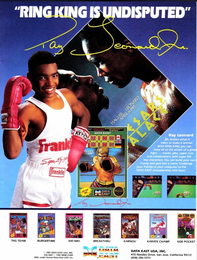 In 1987, Data East released their arcade hit game Ring King on the Nintendo Entertainment System (NES) and prepared this print ad involving Ray Leonard, Jr. (on the foreground in boxing gear) and conveniently with the famous Sugar Ray Leonard and Thomas Hearns (with the promo of their first fight together in the background). Also conveniently, the company inserted their other games on the lowest part of the ad. Ultimately, the presence of Ring King itself was minimized only showing the game cover and two screenshots. This is clearly an eye-catching ad but there was not enough emphasis on the game itself.