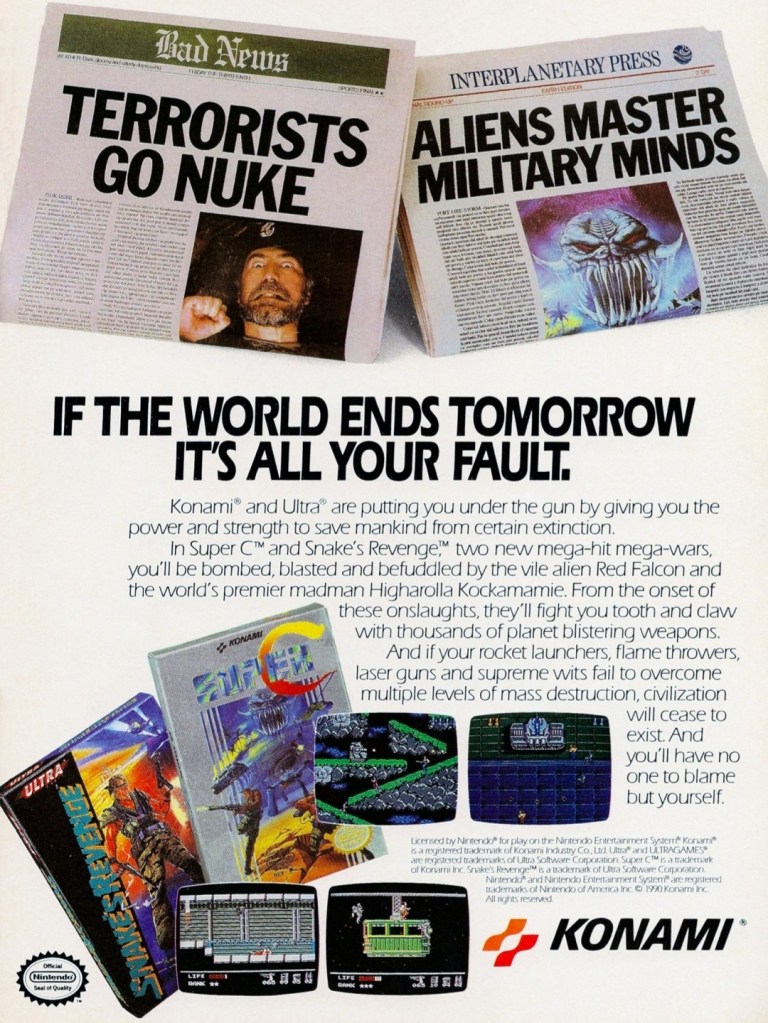 This is one of the ads that Konami came up with to promote at least two games using a single-page ad format. I saw this ad in many comic books I read decades ago and its visual concept always caught my attention especially since I played the console game Contra a lot. At the high end of the ad were two fictional newspaper headlines highlighting the respective conflicts of Snake’s Revenge (with a nuclear danger concept) and Super C (with emphasis on alien invaders). These two games were sequels to the classics Metal Gear and Contra, and Konami clearly knew how to take advantage of the older games’ success and do their best to sell the sequels to gamers who love action-packed gaming as well as fantasized armed conflicts. Like the 2-in-1 ad showcasing Contra and Jackal, this was Konami’s aggressive move to sell war-inspired games to the NES userbase which was mostly composed of children and teenagers.