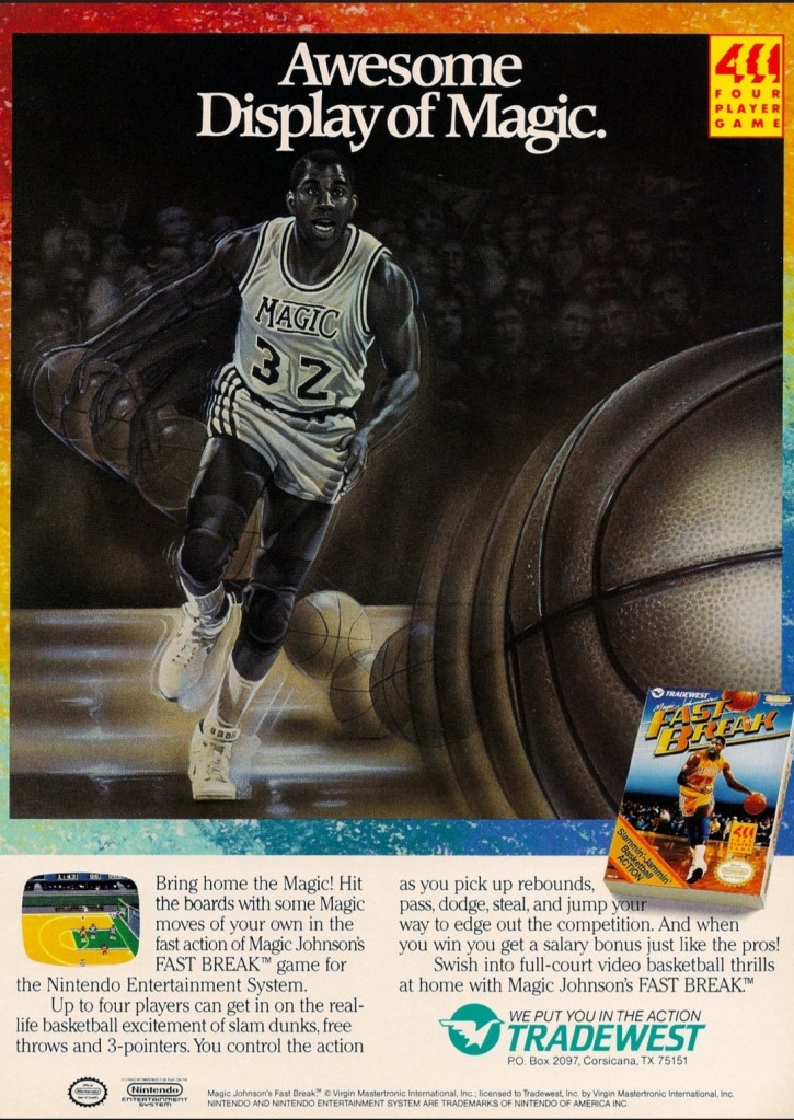 Still on basketball video gaming, the side-scrolling Magic Johnson’s Fast Break game was released on the Nintendo Entertainment System (NES) for console gamers to enjoy. Unsurprisingly, this ad had nice black-and-white art work of Magic Johnson as the dominant figure while leaving little space left to show the game box and only one screenshot. The real meat of this print ad are the details laid down in text description.