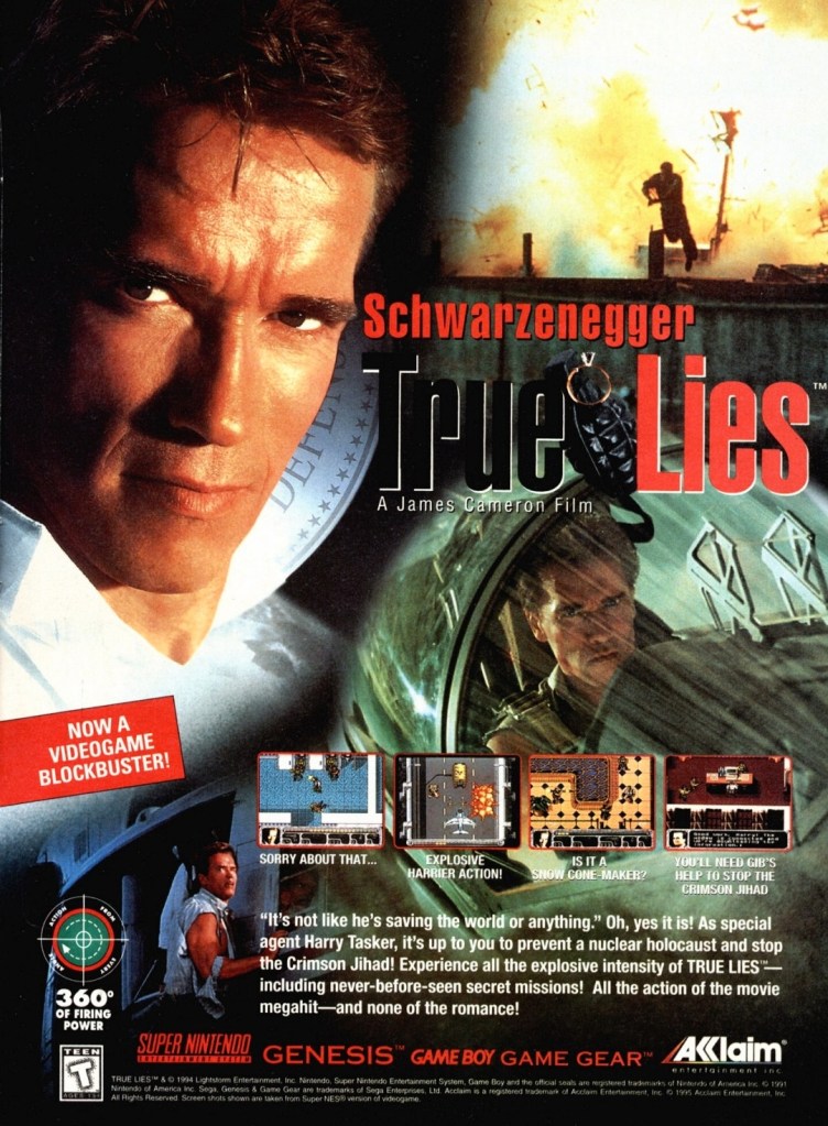 Here is a video game ad I saw in many comic books I read in 1994-1995. True Lies (starring Arnold Schwarzenegger) was one of the big summer season movie hits of 1994 and the video game was part of the business tie-ins with the film. The people who made this print ad made the smart moves of showing not just one but three images of Schwarzenegger to promote the game while leaving some space to show what the game looked like. The True Lies game even had stills from the movie to emphasize the flow of the plot.