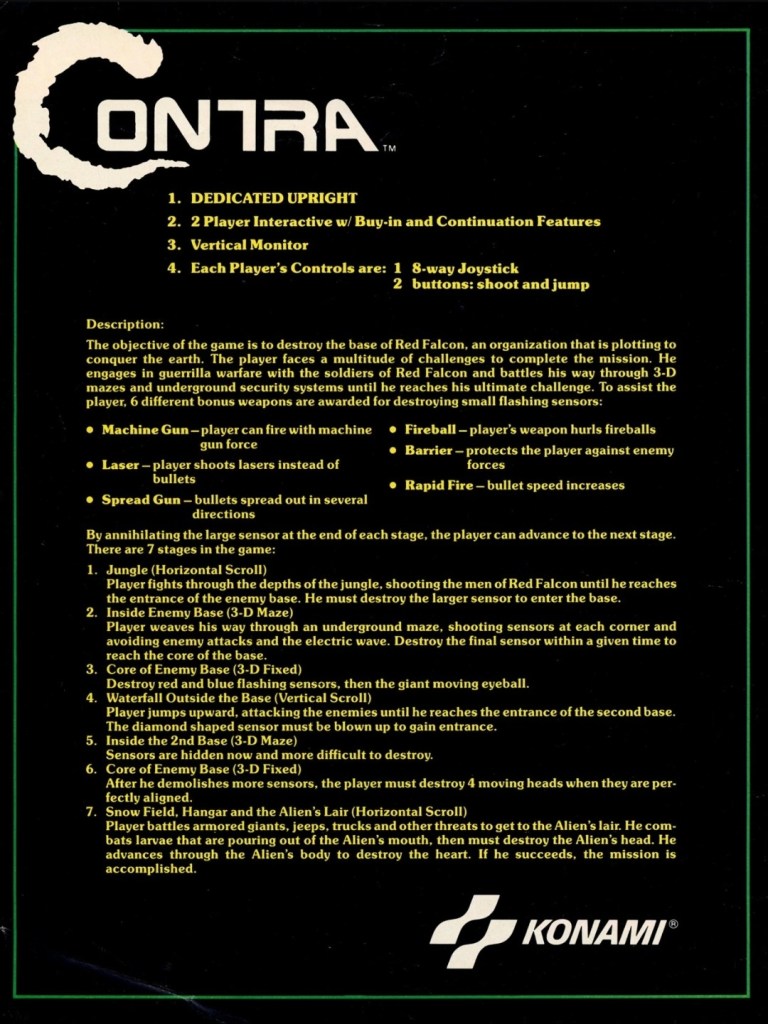 Before it established itself as a popular gaming franchise with console gamers, Contra truly started in the arcades in 1987. First released in Japan on February 1987, Konami went on to release the game in arcades in the United States a month later and the flyer you see here was the Americanized promotion they came up with. Instead of hiring male actors or models to play soldiers, they hired a slim lady to appear with a female Rambo look standing in front of a Contra arcade machine. On the other side of the flyer are details that players and arcade operators can learn from. By today’s standards, this arcade flyer of Contra is still eye-catching and even amusing to look at.