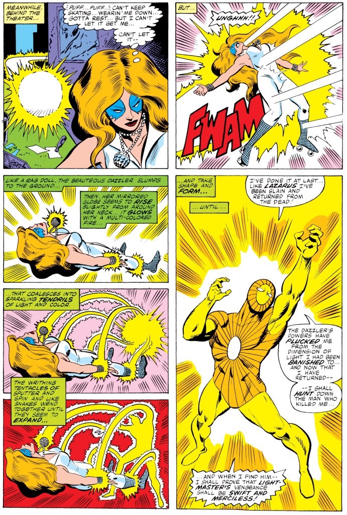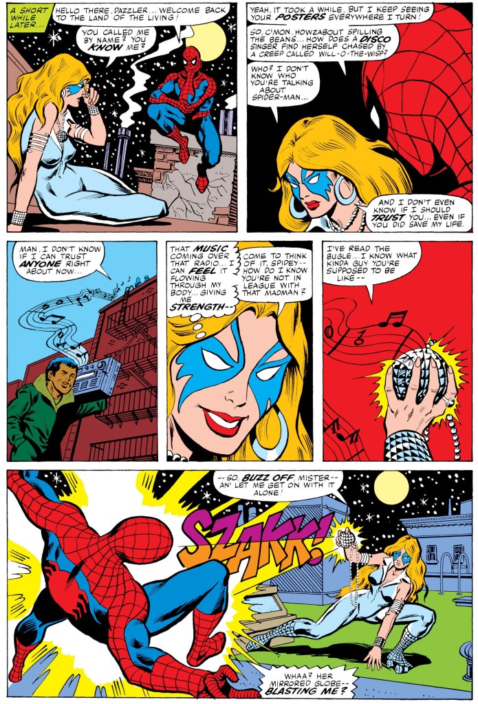 A short while afterward, Dazzler wakes up and starts talking with the webslinger. In response to the mention of Will-o-the-Wisp’s name, she claims to not knowing what he was talking about. As their talk goes on, Dazzler hears music from the street which strengthens her. Using the small mirror globe she is wearing, Dazzler hits Spider-Man with a blast of light pushing him off the building…