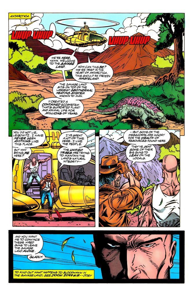 In this comic book, John Francis Moore really kept on focusing on developing the X-Men while keeping the narrative fresh with twists and the occasional moments of shock. While the cover of this comic book expressed the return of the other X-Men member Eddie/Metalhead (who stayed behind and separated from Xi’an’s mutants), the story here surprisingly had much less focus on the X-Men of 2099 and focused more on the Freakshow (which Metalhead is now part of).