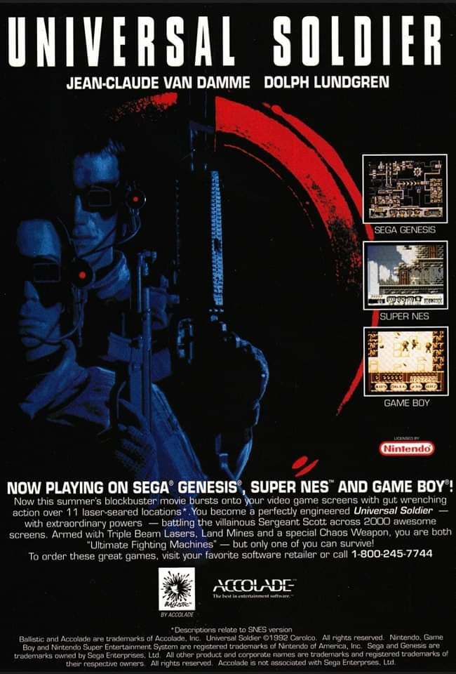 Even though its worldwide ticket sales did not reach $100 million, the 1992 movie Universal Soldier still caught a lot of attention from moviegoers simply because it had Jean-Claude Van Damme and Dolph Lundgren as the stars. Unsurprisingly, the movie had a video game adaptation and because publisher Accolade wanted to cash-in on the film’s hype, they made some deceptive moves by rebranding one of its games (already development) as a tie-in. Advertised as an official adaptation, Universal Soldier was actually a rushed conversion of Turrican II: The Final Fight. This print ad – which even showed the stars’ names – is a reminder of the deception Accolade pulled off.