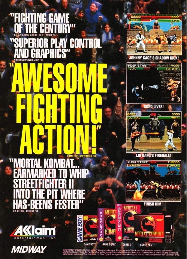Considering how successful it was in the arcades, the 1993 release of Mortal Kombat for game consoles and handhelds was unsurprisingly highly anticipated and publisher acclaim came up with this single-page ad. The presentation involved the use of a photographic background of many spectators (to emphasize excitement and popularity), media quotes and screenshots to effectively promote the game.