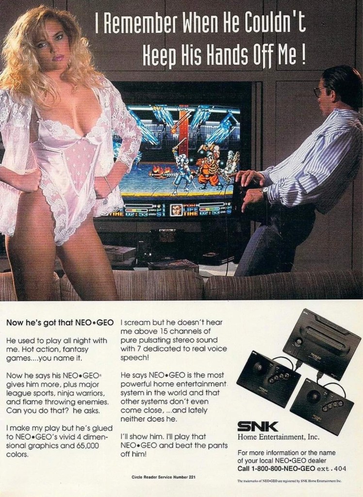 Decades ago, SNK made a huge splash in the arcades with lots of really fun games released with their Neo Geo (stylized as NEO GEO) hardware. In 1990, they released the cartridge-based Neo Geo AES console in Japan and America and it carried the same technology as the arcade hardware. To promote the console in North America (note: the Neo Geo console and its games were very expensive), SNK came up with this catchy and funny print ad showing a sexy woman feeling annoyed that her man spends more time with Neo Geo gaming than with her. This was a clever way of emphasizing the arcade-perfect experience in the comfort of home, and it was funny to look at.