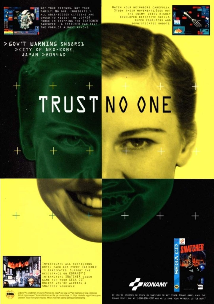 First released in Japan in 1988, Snatcher was a cyberpunk visual adventure game that was one of the early works of the famous Hideo Kojima (Metal Gear series). Due to its design and approach on visuals to tell a story, it was not surprising that a Sega CD version of it got released in 1994. To promote the game to the growing number of North American Sega CD gamers at the time, Konami came up with this rather unusual print ad showing the face of a smiling lady dominating the space leaving little room to show the screenshots and the game’s cover. The visual concept is engaging but it takes effort to notice it was promoting the Sega CD version of the video game. This old ad would have worked better had the ad makers increased the sizes of the screenshots and the game cover.