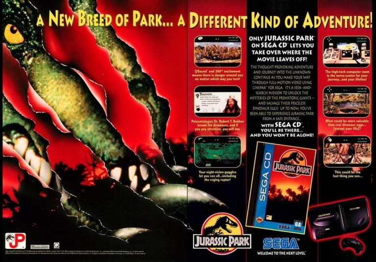 As part of its drive to add more games to the Sega CD add-on and help it sell more units, Sega acquired the Jurassic Park license and went on to produce an adaptation utilizing the technological features of the Sega CD. To aggressively promote the game, Sega came up with this print ad that had a Tyrannosaurs Rex (looking through spaces) on one page and then several screenshots plus text descriptions on the other. For a click-and-point Jurassic Park game, this ad was really exciting and intriguing to look at.