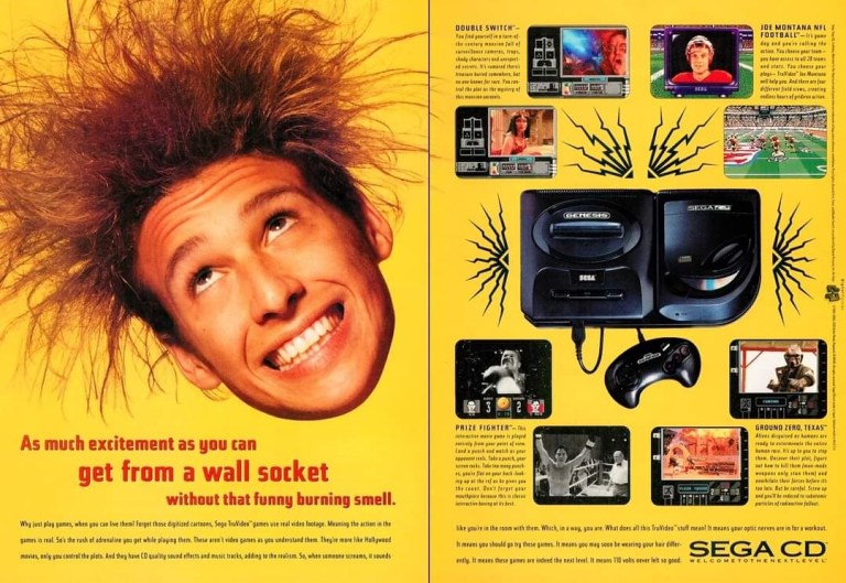 When Sega was making waves with its Sega Genesis (Sega Mega Drive in Japan), the company was quick to react to the growing use of the compact disc (CD) format as a useful storage medium for video games. The Sega CD (Mega CD in Japan) was released as an add-on device to work with the Genesis console and Sega’s American team came up with a series of promotions. This print ad is just one of the promotions and ad makers came up with a “crazed” or “electrified” gamer dominating one page while showing the Genesis, the Sega CD and screenshots of games (running on CD) on the other page. By today’s standards, the Sega CD print ad is funny and catchy to look at.