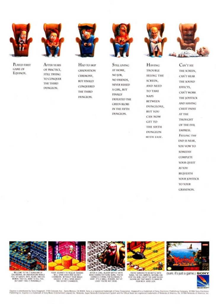 I never played Equinox but I heard the loud buzz about its design as a 3D isometric game that had elements of exploration, platform play and puzzle solving. The people responsible for this print ad emphasized the concept that the game is so addicting to play, players will still play it as they get older. This ad has a subtle yet effective approach with humor.