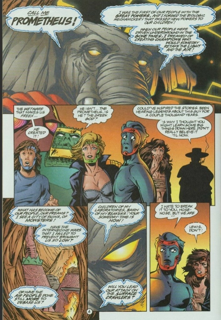 More on the Freex themselves, the revelation that the members’ powers were the result of being injected (by Wetware Mary) into them with the substance created by Prometheus resulted in dramatic reactions from them which also adds to the tension of their current misadventure together so far away from society. The revelation also added tremendous weight into the series’ narrative raising questions such as the following: Wow will each Freex member reintegrate into society as they know the truth about what caused them to have powers/abnormalities? Where will they go once they made it back to the surface? Will they keep secret the existence of Prometheus?