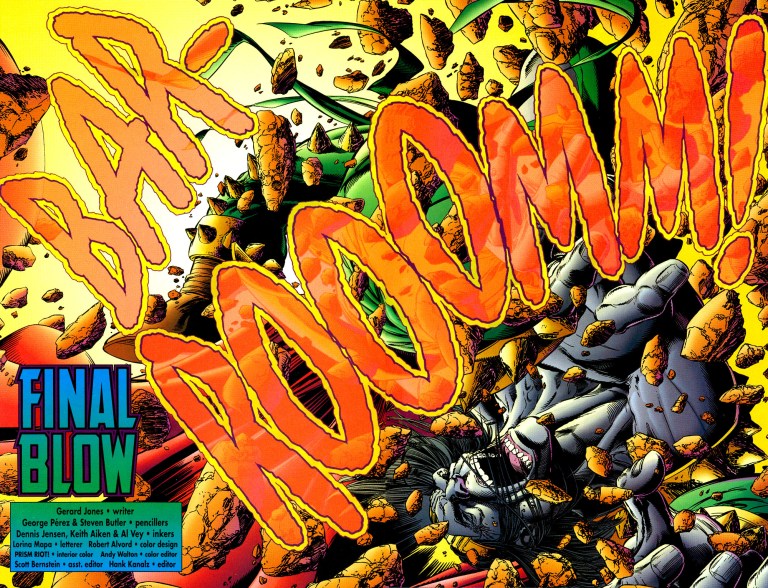 More on UltraForce, the saga of king Atalon’s fire people rising from the depths of the Earth and possessing nuclear missiles to attack people on the surface has lasted quite long and its narrative remained consistently engaging. In issue #5, something terrible happened to UltraForce member Pixx during a big battle. What transpired next, we can find out in this look back at UltraForce #6, published in 1995 by Malibu Comics with a story written by Gerard Jones and drawn by George Perez and Steve Butler.